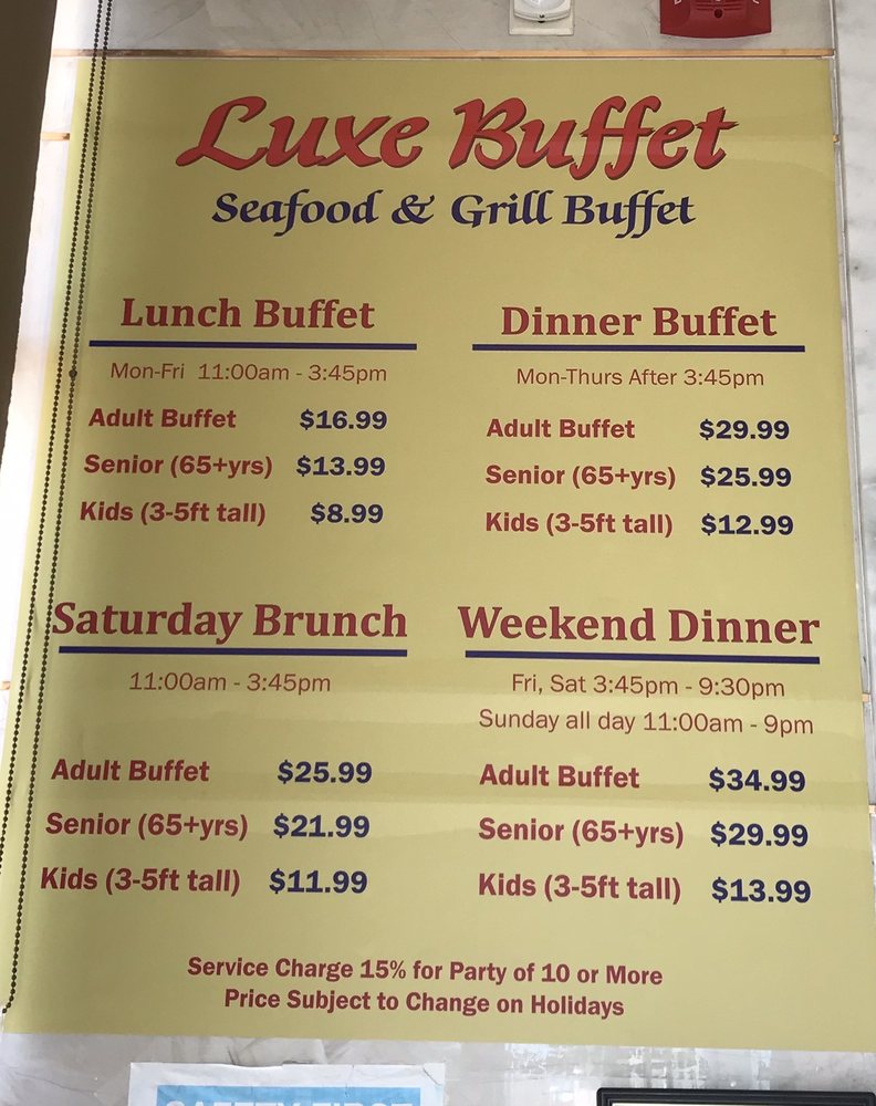 Introducing The Luxe Buffet, a buffet, sushi bar, and seafood paradise located in Ontario, CA. With a wide range of options, including vegan and vegetarian dishes, this restaurant caters to all dietary needs. The welcoming staff and diverse menu, featuring items like frog legs, crab legs, lobster claws, and sushi with flavorful sides, ensure a delightful dining experience. The dessert section, complete with pastries, ice cream, fresh fruit, and a chocolate fountain, is a highlight for both kids and adults. The luxe buffet also offers amenities like private dining, free Wi-Fi, and happy hour specials, making it perfect for any occasion. With rave reviews from customers praising the fresh and tasty food, The Luxe Buffet is a must-visit destination for food lovers.
